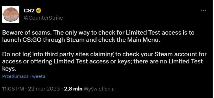 Therefore, if you want to obtain your personal key for CS2 beta, you must simply wait and hope for luck. Unfortunately, as is often the case with such big news, numerous scam sites have been created to deceive players into providing their Steam account information. This problem was also addressed by Valve on Twitter.