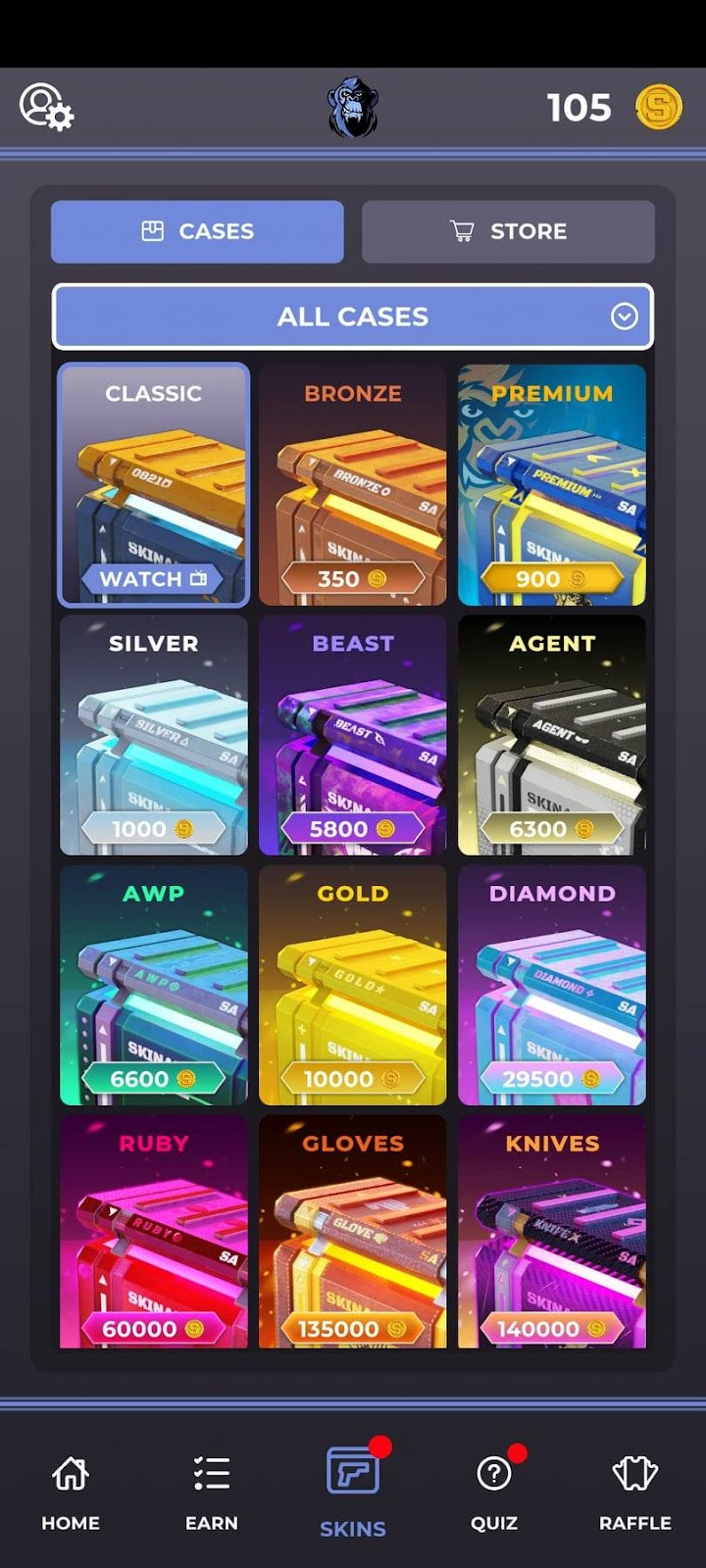 Кроме того, SkinApe предоставляет вам не только возможность покупать оружие напрямую, но вы также можете получить кейсы. Кейсы представлены следующим образом: