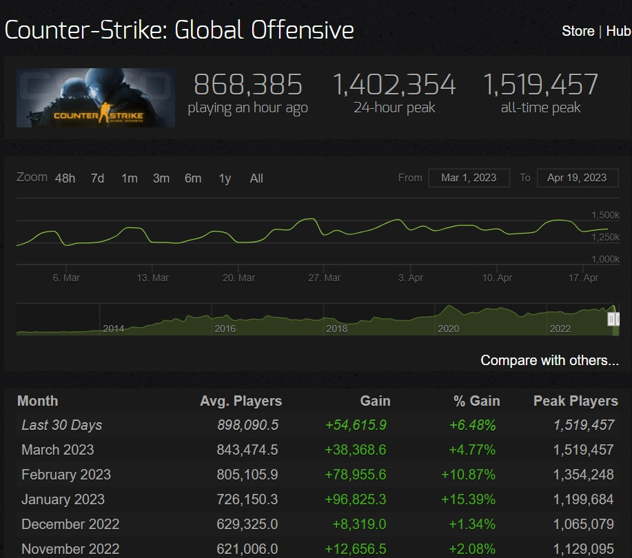 Как мы упоминали во вступлении, в марте 2023 года были побиты два рекорда. Первый - количество открытых игроками кейсов, а второй - рекорд числа игроков. В последние недели CS:GO достигла новых высот в отношении количества зарегистрированных игроков в игре. Рекорд одновременного онлайна в 1 302 348 игроков был побит 11 февраля 2023 года, когда в игре зарегистрировалось 1 320 219 игроков. Число игроков было настолько впечатляющим, что многие люди думали, что нам придется ждать долго, чтобы увидеть, как этот рекорд будет побит. Однако мы ошиблись. Рекорд был побит всего через восемь дней, 19 февраля 2023 года, когда число одновременных игроков составило 1 324 000. Рекорд был побит снова и снова, наконец достигнув впечатляющего числа в 1 519 457 одновременных игроков в выходные (субботу, 25 марта 2023 года и воскресенье, 26 марта 2023 года). Это особенно впечатляюще, учитывая, что игра была выпущена более 11 лет назад. Такой рост популярности, вероятно, связан с объявлением о CS2. Текущий пик в 1 519 457 делает Counter-Strike: Global Offensive второй по величине игрой на Steam, превзойденной только PUBG: Battlegrounds с рекордом в 3,2 миллиона одновременных игроков. Упомянутые выше статистические данные были взяты с сайта Steam Charts.