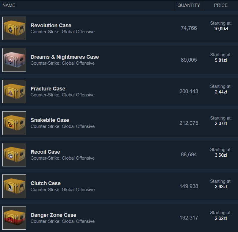 Цены на старые предметы также падают при выпуске новых скинов (игроки продают свои старые скины, чтобы купить новые), поэтому рынок переполнен и цена падает. С другой стороны, старые скины могут стать дороже из-за того, что их будет труднее получить, а предложение на Steam Market уменьшится. Desert Eagle Golden Koi был одним из самых популярных скинов в игре, когда он был введен 19 сентября 2013 года. В начале он стоил всего около $20. В наши дни его гораздо сложнее получить, поэтому его цена составляет более $100.