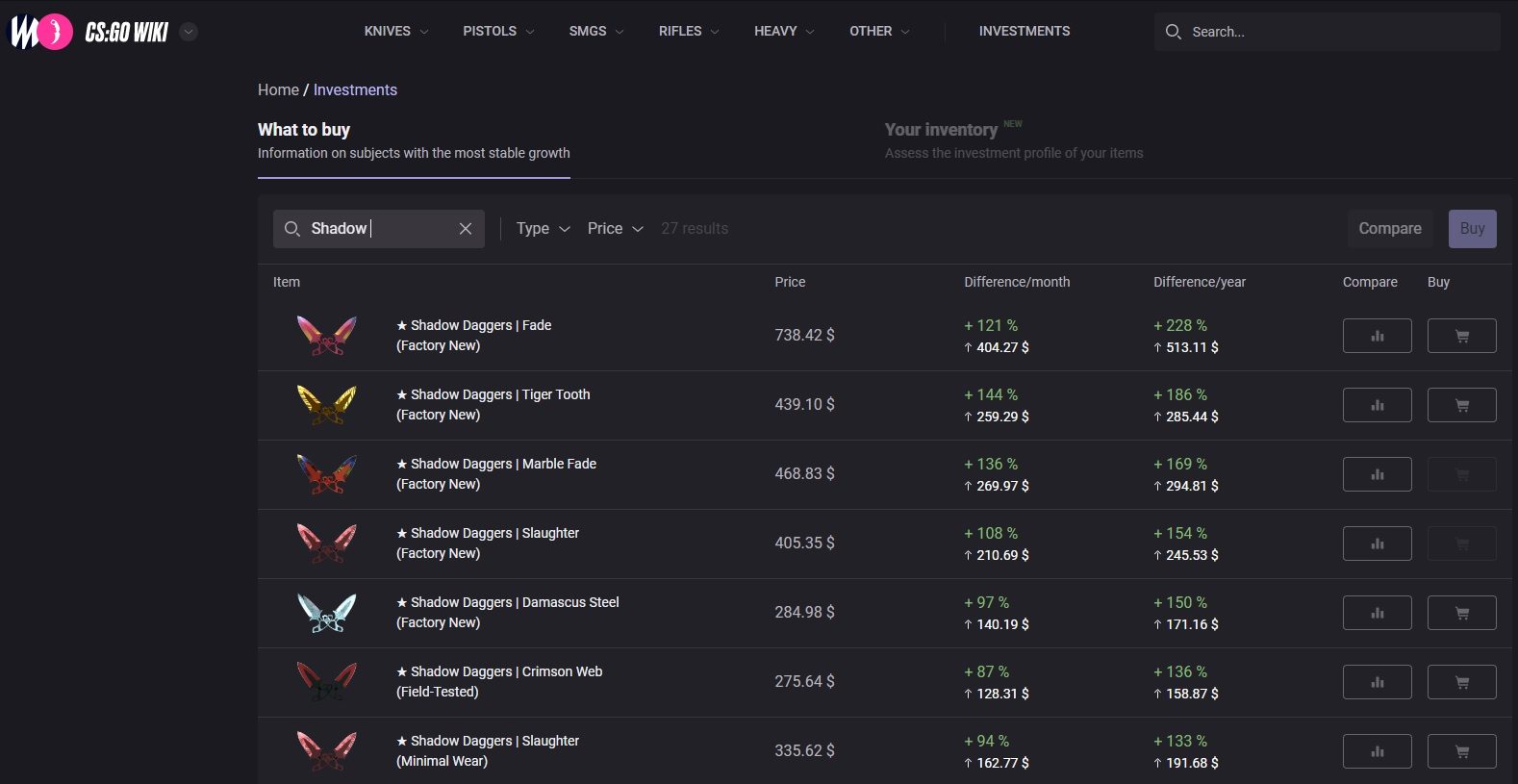 Нельзя отрицать, что текущее состояние рынка скинов в КСГО стало диким после объявления о CS2. Цены на все возможные предметы подскочили вверх, от скинов и стикеров до самих кейсов, став более дорогими, и некоторые из этих предметов удвоили свою стоимость. Однако следует отметить, что некоторые изменения цен, вызванные объявлением, являются результатом манипуляций на рынке, задуманных несколькими людьми. Тем не менее, не отрицается тот факт, что цена на некоторые ножи в игре выросла более чем на 100%. Примером может служить Shadow Daggers Fade, стоимость которого выросла на 170% за три месяца. Вы легко можете проверить колебания цен на вики-странице CS:GO investments. Этот сайт предоставит вам всю необходимую информацию.